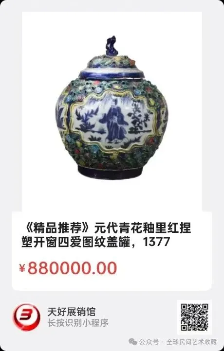 元代青花釉里红捏塑开窗四爱图纹盖罐,白浒孤窑窑系是中国六大名窑之一,南宋初期创烧,元代工艺水平抵达最高,明末清初熄火,位于今江西省抚州市临川区温泉镇白浒渡村一带。它的工艺技术为景德镇元代新瓷都的兴起奠定了基础。宋代临川产贡酒,史有宋神宗赐大臣品尝临川酒时曰:此乃临川之佳贡也。存酒器就是白浒孤窑所出,白浒孤窑的“孤”字,是孤家寡人的含义。显然不是一般民用器,是按皇家官窑要求烧制的官窑供器!高38宽33cm。2025年 3月 12日,经天好评审团评审,以6票优势荣登精品榜,获第162期天好海选精品。1377.V.