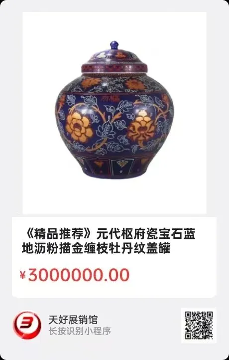 元代枢府瓷宝石蓝地沥粉描金缠枝牡丹纹盖罐,枢府瓷是元代景德镇窑创烧的一种官用瓷器,专为元代军事机构枢密院定制。此罐胎体厚重、釉面失透,瓶身铭文:枢府。高38宽33cm。2025年 7月 2日,经天好评审团评审,以6票优势荣登精品榜,获第177期天好海选精品。来源1377.V.