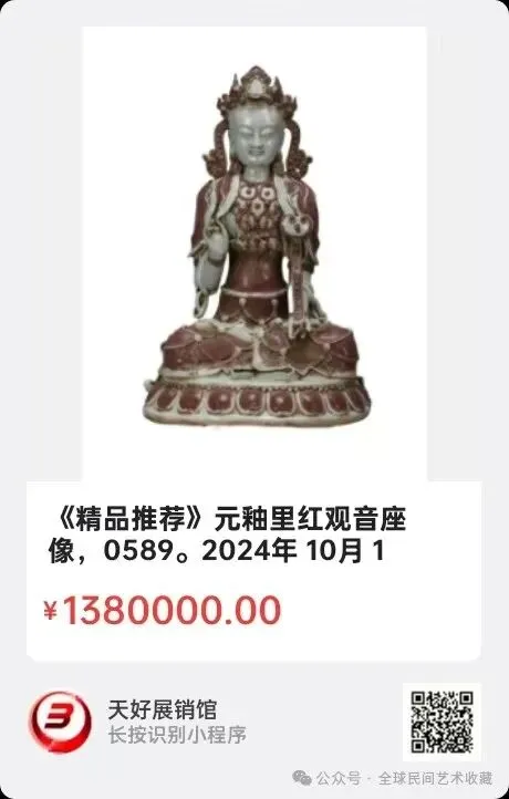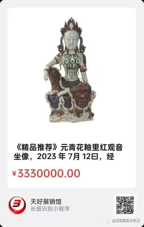 元青花釉里红观音坐像,人物栩栩如生,活灵活现,工艺精湛。观音菩萨浑身珠光宝气,坐姿优雅,神态巧妙,气韵恢弘,富态端庄。设计周密细致,开物巧夺天工,青花釉红真功夫,包浆老气傻开门。文化意境深邃,艺术品味十足。高56cm,宽30cm,尺度大。2023 年 7月 12曰,经天好评审团评审,以 6票优势荣登精品榜,获第八十九期天好海选精品。来源1377.V.