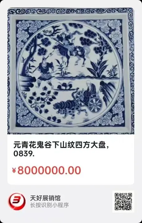 元青花大盘,尺寸如下:直径45.5厘米,高7厘米,青花用料为典型的进口料--苏麻离青,其人物,动物包括花草等,画工精准到位,线条流畅自然,不失为一件元代精美的艺术精品……。这种瓷盘在拍卖市场上的价格非常昂贵。例如,2005年伦敦佳士得拍卖会上,一个元青花鬼谷子下山图纹大罐,以1568.8万英镑(约合2.3亿元人民币)的价格成交,创下了当时中国元代艺术品拍卖的最高价。总结来说,元青花鬼谷子下山青花大盘,是一种具有深厚历史背景和高度艺术价值的瓷器,其市场价格昂贵,收藏意义重大。来源1159.V.