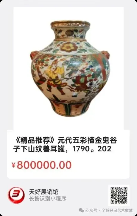 元代五彩描金鬼谷子下山纹兽耳罐,高度35cm,口径15.5cm,底径18cm,2025年 4月 16日,经天好评审团评审,以6票优势荣登精品榜,获第167期天好海选精品。来源1790。V.
