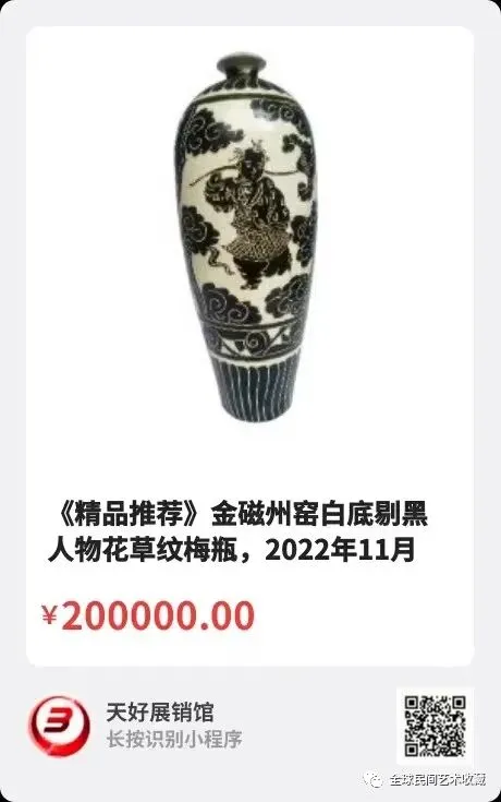 金磁州窑白底剔黑人物花草纹梅瓶,金代磁州窑白底剔黑人物花草纹梅瓶,高:40㎝上直径:15㎝底直径:9㎝。2022年11月2曰,经天好评审团评审,以6票优势荣登精品榜,获第六十一期天好海选精品。来源1069.V.