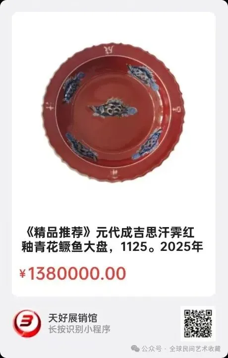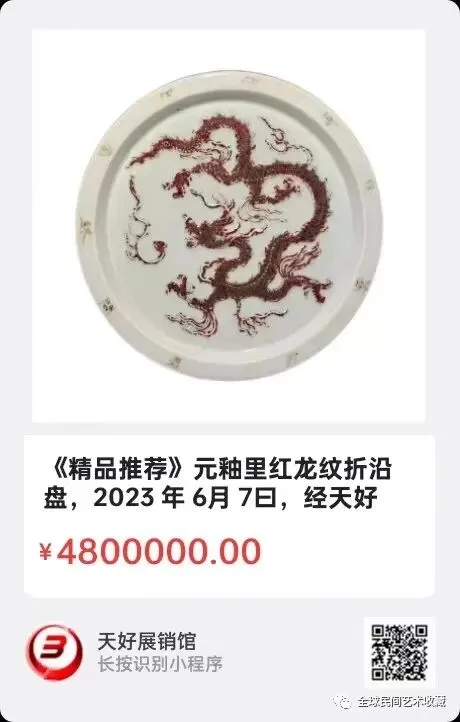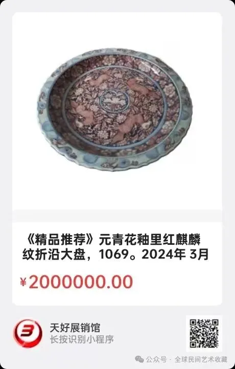 元青花釉里红麒麟纹折沿大盘,口径:59、5㎝,底径:40、5㎝,高:8㎝。2024年 3月 13日,经天好评审团评审,以6票优势荣登精品榜,获第118期天好海选精品。来源1069.V.