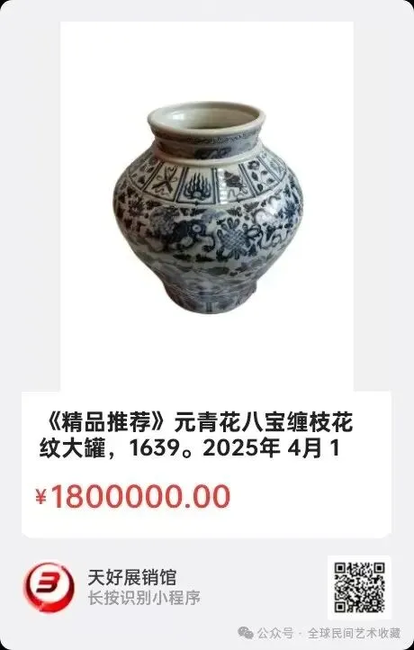元青花八宝缠枝花纹大罐,高36cm,宽33cm,口径19cm,足底20cm,2025年 4月 16日,经天好评审团评审,以6票优势荣登精品榜,获第167期天好海选精品。来源1639.V 。