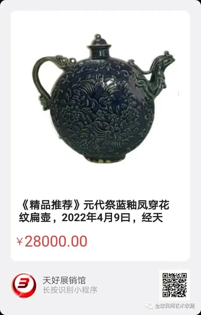 元代祭蓝釉凤穿花纹扁壶,器物高:27公分,宽:28公分,全品象;全部图片迹象纯属该实物的真实特征。2022年4月9曰,经天好评审团评审,以6票优势荣登精品榜,获第三十七期天好海选精品。来源0343.V.