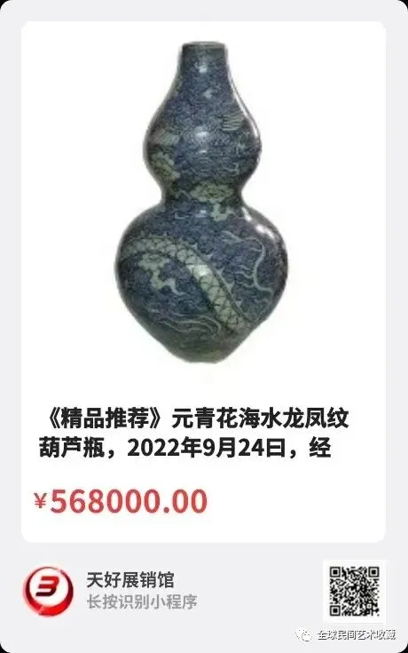 元青花海水龙凤纹葫芦瓶,器物高48公分,腹径25.8公分;全品象。2022年9月24曰,经天好评审团评审,以6票优势荣登精品榜,获第五十七期天好海选精品。来源0343.V.