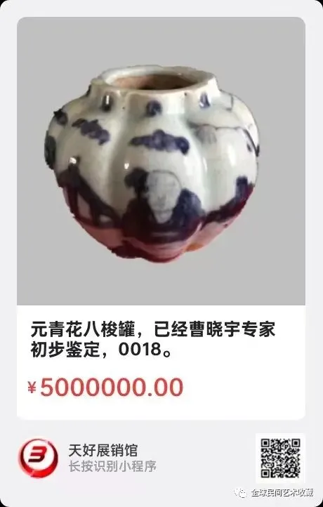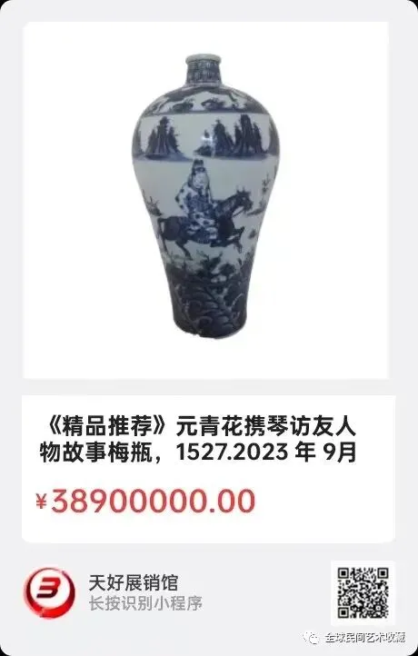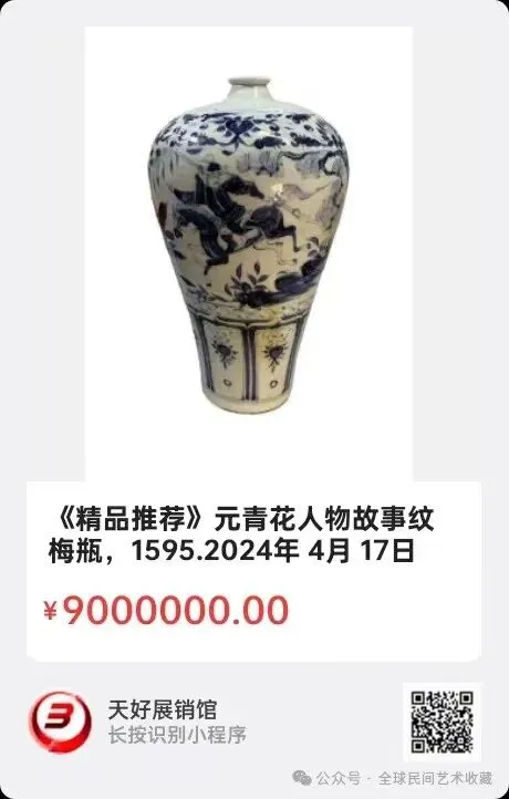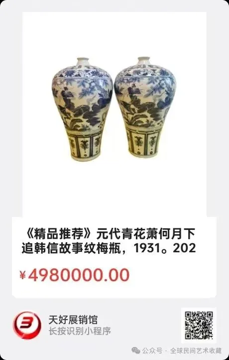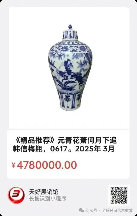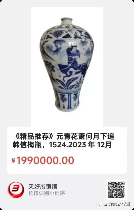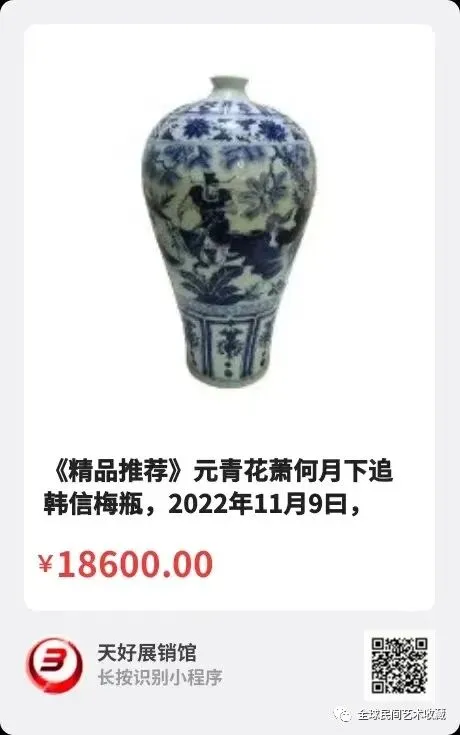 元青花萧何月下追韩信梅瓶;藏品尺寸:高45公分,口径5.8公分,足径13.8公分,全品象;自鉴简述:宏观看藏品的器形,纹饰,工艺及几何尺寸等方面与南京博物馆的那件萧何月下追韩信梅瓶大同小异;微观痕迹鉴定釉面有:可见有流淌感线纹+串珠纹+网络纹等苏料痕迹特征+老化痕迹结晶簇;下面的图片迹象纯属该器物的真实特征,请评委老师予以鉴评。谢谢!2022年11月9曰,经天好评审团评审,以6票优势荣登精品榜,获第六十二期天好海选精品。来源0343.V.