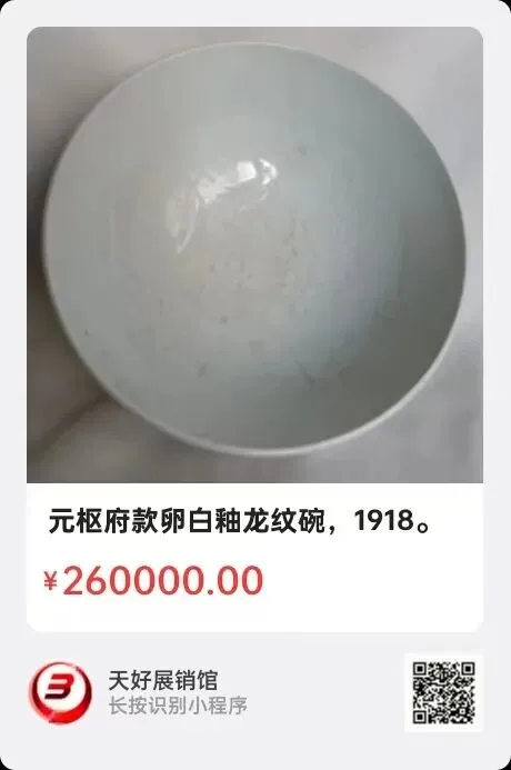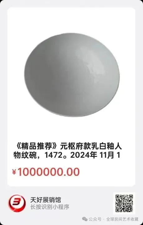 元枢府款乳白釉人物纹碗,高8公分,口直经20公分。为元时己知著名的官款创烧瓷器。2024年 11月 13日,经天好评审团评审,以6票优势荣登精品榜,获第151期天好海选精品。来源1472。