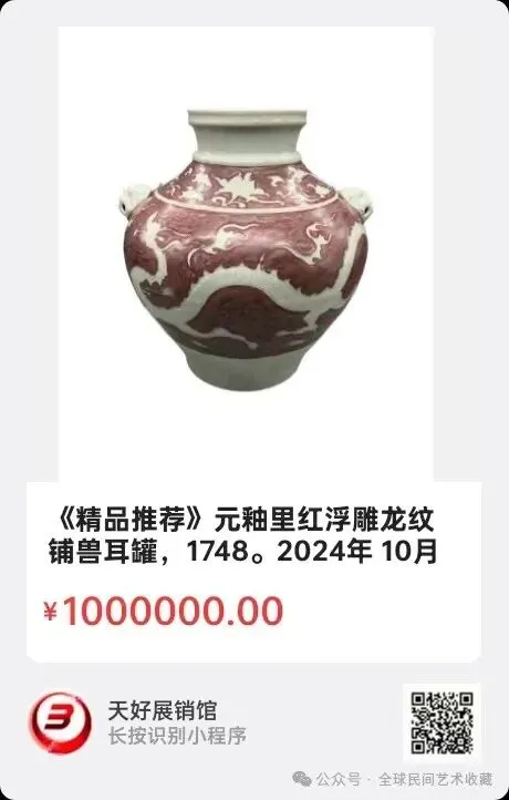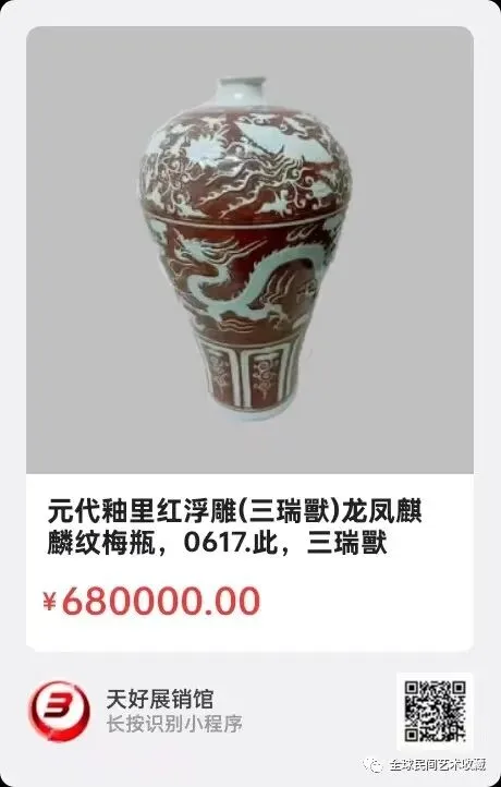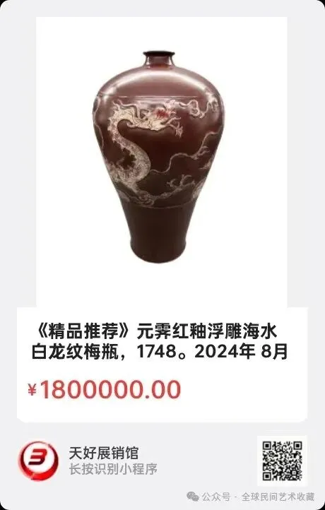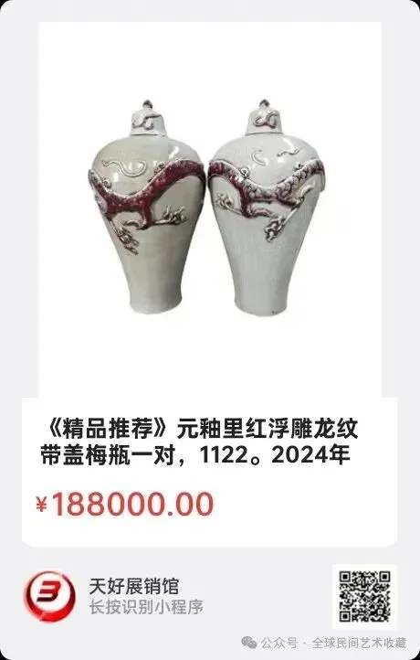 元釉里红浮雕龙纹带盖梅瓶一对,高:49厘米,腹:25厘米,底:13厘米。2024年 11月 13日,经天好评审团评审,以6票优势荣登精品榜,获第151期天好海选精品。来源1122。