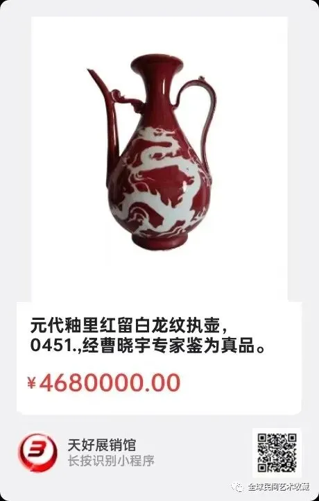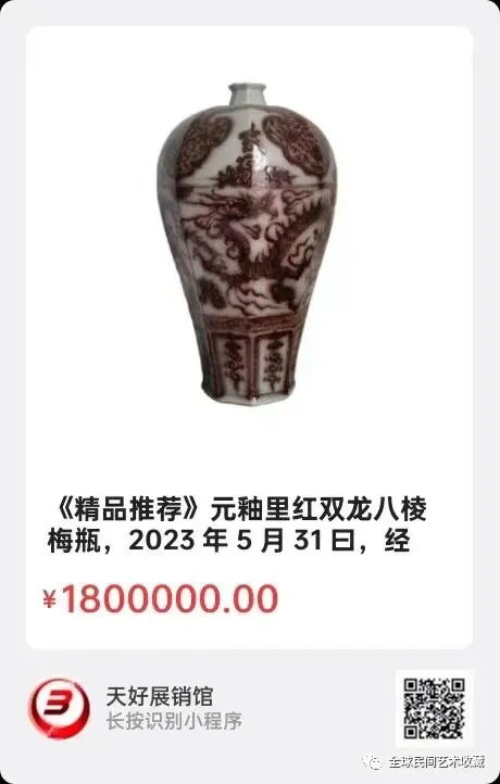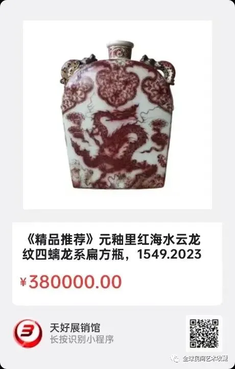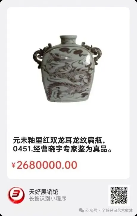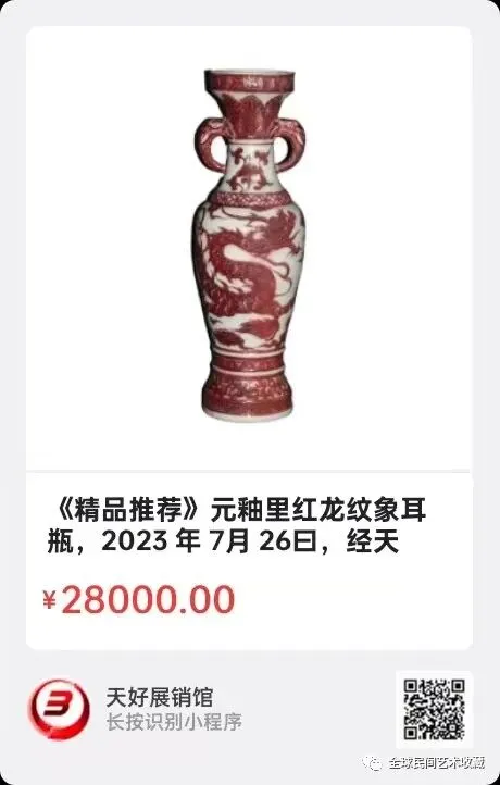 元釉里红龙纹象耳瓶:器物尺寸:高度:40cm:口径:10cm:底径:10.8cm:2023 年 7月 26曰,经天好评审团评审,以6票优势荣登精品榜,获第九十一期天好海选精品。来源1238.