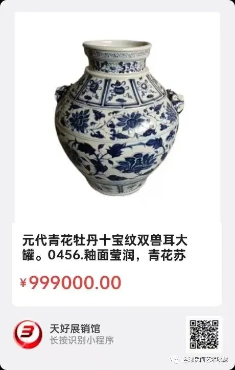 元青花缠枝牡丹纹双兽耳大罐,尺寸:高38,胸径34,口径16,足径8.6公分,全品象;简述:宏观看该器物的器形,纹饰,工艺等方面都有元青花的时代特征风范;特别是微观痕迹鉴定:釉面色浓处有微凹感铁锈斑+流淌感线纹+银白色的铁锈霜+结晶斑+串珠纹+网络纹等苏料青花瓷的特征迹象;以下图片纯属该器的真实特征迹象,请老师们依据图片予以鉴评。谢谢!2023 年 7月 12曰,经天好评审团评审,以 6票优势荣登精品榜,获第八十九期天好海选精品。来源0343.V.