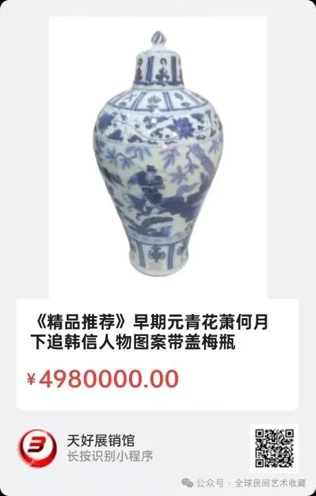 元青花萧何月下追韩信梅瓶, 尺寸:高44厘米,口径5.5厘米,底径13.7厘米。2023 年 12月 6曰,经天好评审团评审,以6票优势荣登精品榜,获第109期天好海选精品。来源1524.