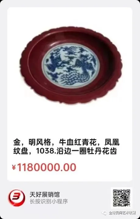 金,明风格,牛血红青花,凤凰纹盘,沿边一圈牡丹花齿,色泽漂亮,红宝石光泽,包浆醇厚,盘中青花,双凤飞舞,吉祥云如意美品。规格:直径20.20㎝,高4.20,底径13.10。己经曹晓宇专家鉴定。来源:1038。