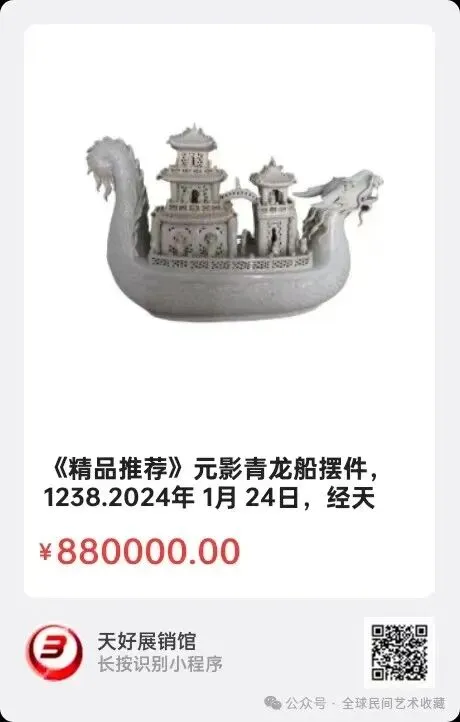 元影青龙船摆件,舟长58cm,舟高46cm,舟宽20cm,2024年 1月 24日,经天好评审团评审,以6票优势荣登精品榜,获第115期天好海选精品。。来源1238.