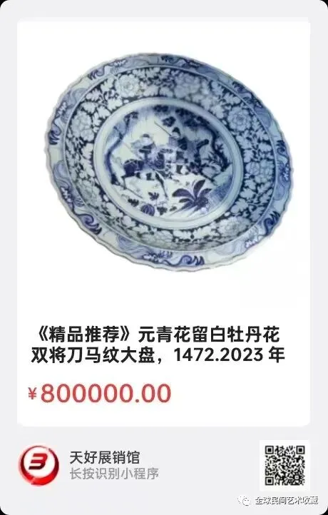 元青花留白牡丹花双将刀马纹大盘,高15公分,直经48公分。此类画人物元青花双骑将军大盘少见。2023 年 11月 8曰,经天好评审团评审,以6票优势荣登精品榜,获第105期天好海选精品。来源1472.