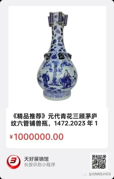 元代青花三顾茅庐纹六管铺兽瓶,高60公分,口直经10公分,6个穿带管,六个神人头,中肚直经32公分,底经21公分。2023 年 11月 15曰,经天好评审团评审,以6票优势荣登精品榜,获第106期天好海选精品。来源1472.