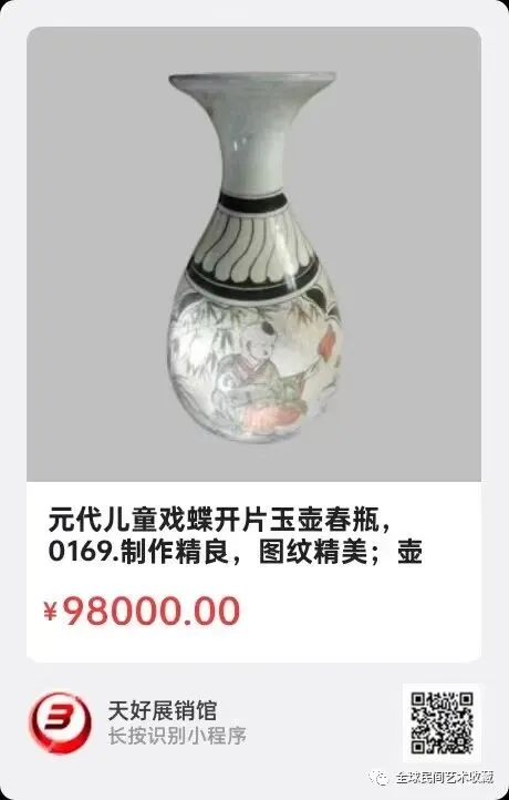 元代儿童戏蝶开片玉壶春瓶,瓶高30㎝,中径18㎝。制作精良,图纹精美;壶身开片细密,包浆古朴;两儿童持扇戏蝶,栩栩如生,其衣着呈现宋元时代服装,彰显元代瓷器的高度艺术成就。(类似玉壶春瓶近10年拍卖价大都超过一百万元)。收藏者:尹本顺(尹笋君,74岁)是上世纪知名收藏家丶文物考古专家丶科普作家,北京人民大会堂表彰的“全国百佳新闻文化工作者”、原工作单位以红头文件上报为全国劳动模范,成果简历入选多家中国收藏家大辞典,2000年前后三次入选权威的《世界名人录》(分中文、英文版,天安门左前方中国国家图书馆和世界各大图书馆都有展示丶出借)。来源:0169。