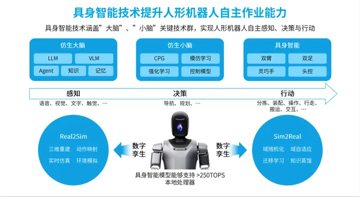 AI与人形机器人的协同,核心是实现“感知-决策-执行”的全链路自主闭环,彻底突破传统自动化产线的刚性局限。AI为生产线提供“智慧大脑”,负责环境感知、路径规划与动态决策;人形机器人则作为“执行载体”,凭借类人躯体结构与柔性操作能力,适配复杂工业场景,两者结合实现1+1>2的赋能效果。