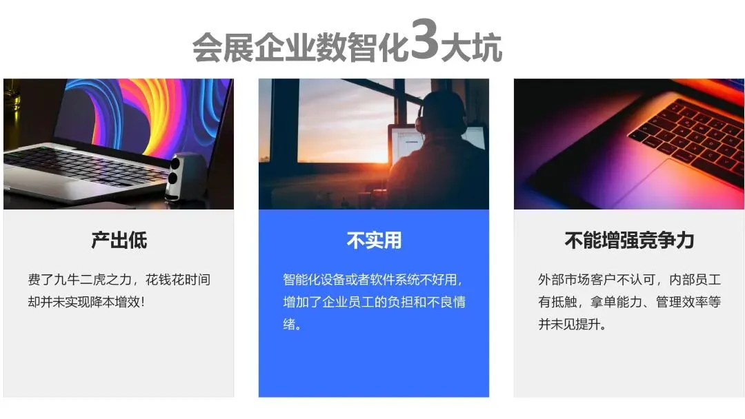 3. 坑3:脱离行业实际,照搬其他模式。照搬互联网、制造业的数智化方案,不结合会展行业“场景杂、周期短”的特点,最后水土不服,无法落地,只能不了了之。