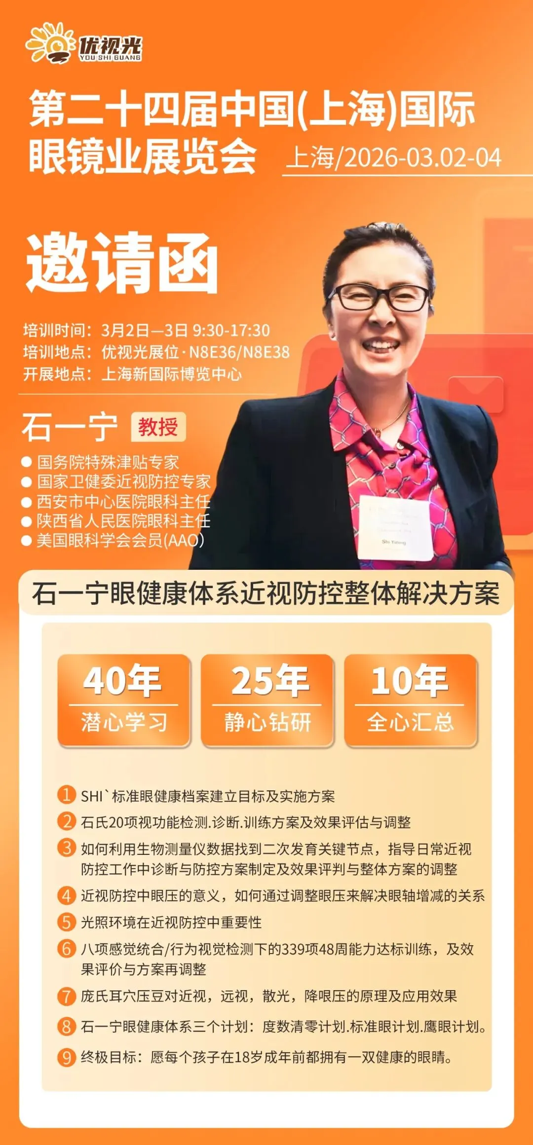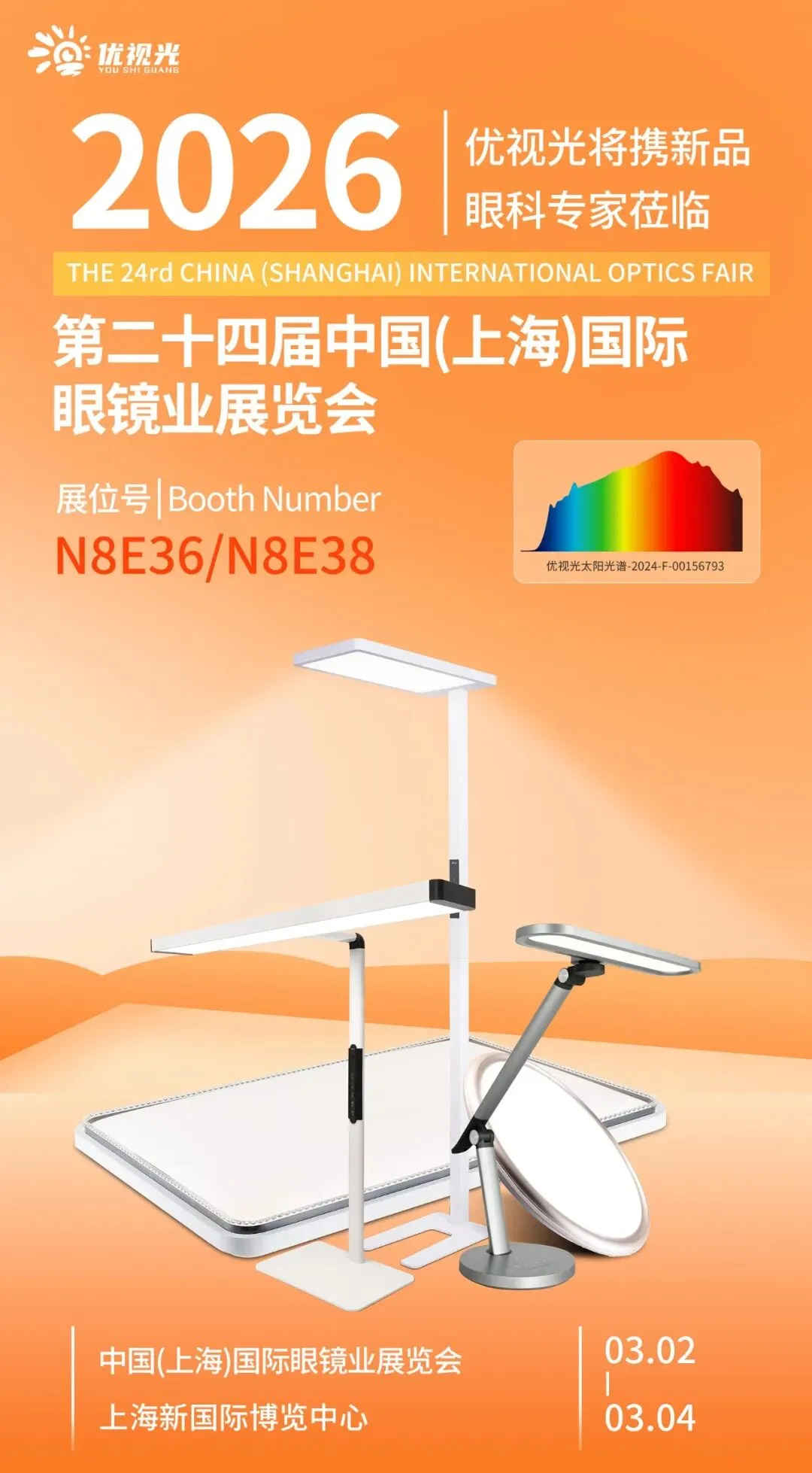 作为眼视光渠道知名品牌,优视光再次受邀将携全系列护眼产品矩阵重磅亮相本届展会:✅ 新品首发:护眼台灯、大路灯、吸顶灯及家庭全域阳光解决方案集体亮相,重新定义健康光环境;✅ 钜惠政策:展会专属特大福利,现场签约享惊喜折扣,助力渠道伙伴共赢2026;✅ 专家赋能:特邀国务院特殊津贴专家、国家卫健委近视防控专家石一宁教授携团队亲临展位,为视光学员带来现场授课,解析儿童近视防控与科学用光的核心秘籍!