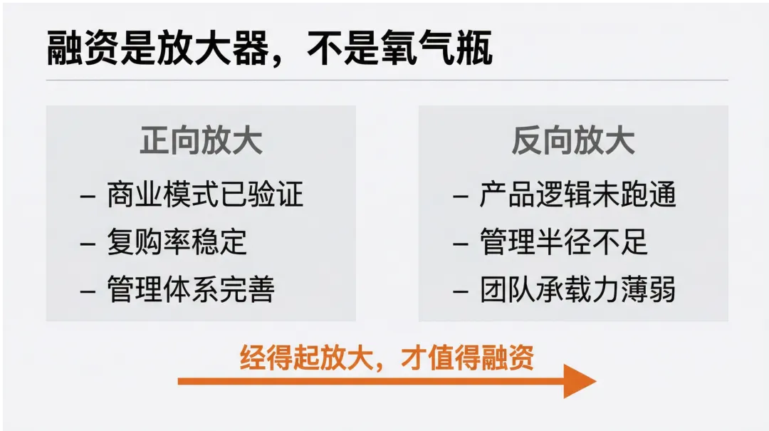 你的商业模式跑通了,复购率30%,转介绍率20%,这时候来一笔钱,你可以把验证成功的模型复制到十个城市。钱放大的是你的确定性。