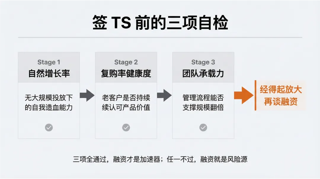 基于这个认知,我建议所有准备融资的创始人,在签TS之前,先做三个自检: