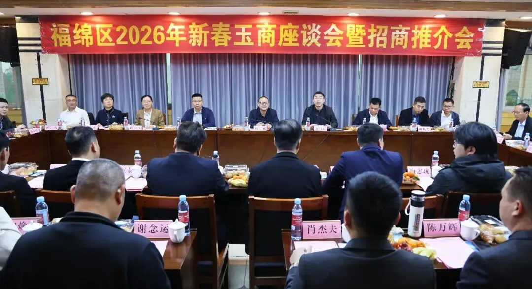 2月22日(正月初六),福绵区召开2026年新春玉商座谈会暨招商推介会,与广大玉商企业家代表齐聚一堂,共贺新春、共叙乡情、共话发展,为福绵发展凝心聚力,携手谱写福绵区高质量发展新篇章。区委书记刘猛出席会议并讲话,区委副书记、区长朱伟经主持会议。