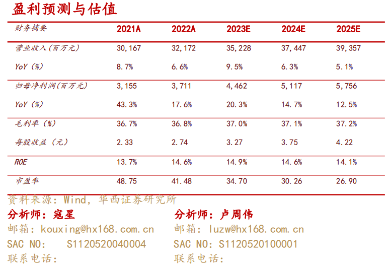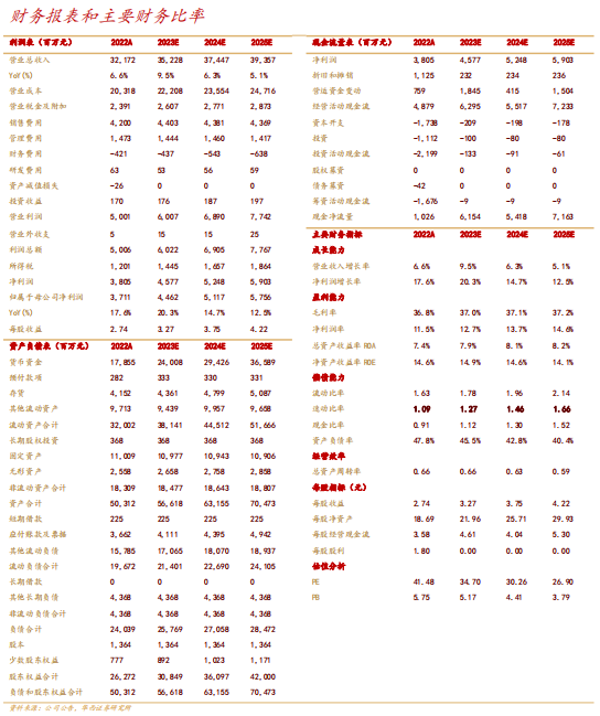 参考最新财报,考虑到公司利润端表现超出之前预期,我们维持公司23-25年352.28/374.47/393.57亿元的预测;上调23-25年EPS为3.23/3.67/4.04元的预测至3.27/3.75/4.22元,对应4月24日收盘价113.5元,PE分别为35/30/27倍,维持“买入”评级。