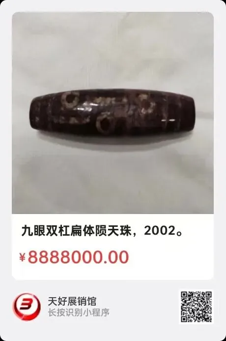 九眼双杠扁体陨天珠,长5.9cm、宽1.9cm、厚1.5cm、重25.2克 ,陨天珠也叫至尊老天珠,它是一种稀有宝石,是来自宇宙火星降落的特殊陨石。有记载的历史三千多年左右。陨天珠具有卓越的品质,显赫的外表,珠体内有神奇变幻莫测的微观景象,赏心悦目,迷离扑朔的精美画面,让爱好者无法拒绝它那艳美娇媚,深沉凝重的高贵。用显徽镜观看它体内的管状、微藻、绒花、川蔓等结构,象是火星上微生物化石,内里润藏着宇宙强大的磁场能量体。它的能量体对人体有益的神奇功能更是妙不可言。陨天珠是独一无二的,是人间稀有珍宝,是人见人爱的圣物,拥有一颗陨天珠是上天的恩赐。来源2002.V。
