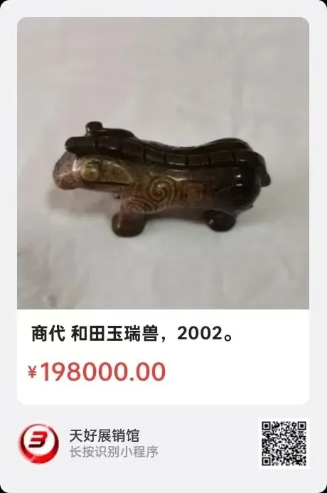 商代 和田玉瑞兽,长6.9cm 、高 4cm、宽2.4cm ,商代和田玉瑞兽是商代贵族喜好把玩的珍贵物品。瑞兽形态自然灵动,雕工精细,身上有浅浮雕花纹,身体、头和四条腿协调流畅,臣字眼,中间上下有对穿孔,背有凸起的波断纹,小巧玲珑。土沁、汞沁润净清晰,包浆厚重自然,品相精美,是少见的商代玉器精品。来源2002.V。
