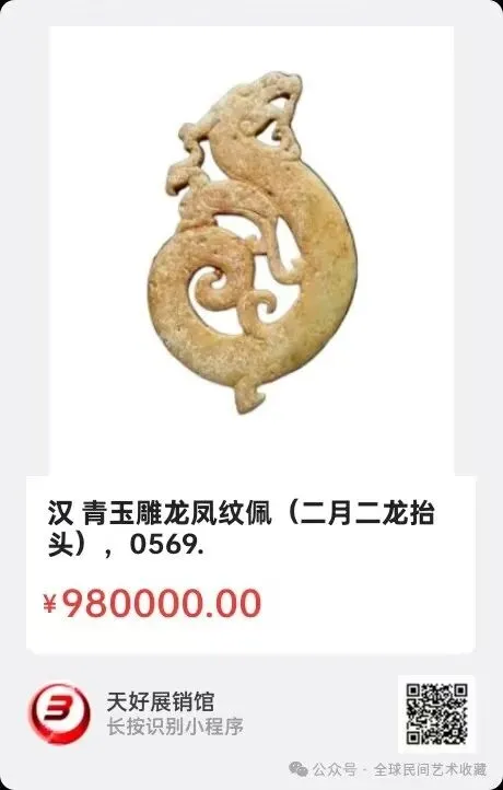 汉 青玉雕龙凤纹佩(二月二龙抬头),高8.8㎝,宽5.3㎝,整佩件沁色开窗,从沁色到全部,留有一小部分,还能看到原底子,镂雕精美生动,底子打磨光亮平整,龙纹大气张狂,纹饰毫厘之间相接精细,龙身采用游丝毛雕工艺,细观玉佩,惊叹其工,可圈可点。是一件罕见的汉代龙凤玉佩。来源0569.V.