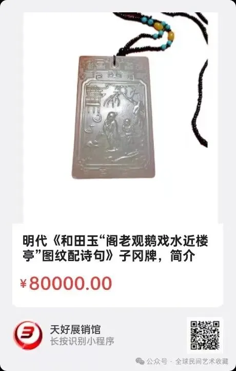 明代《和田玉“阁老观鹅戏水近楼亭”图纹配诗句》子冈牌,高8.4㎝,厚0.7㎝,宽5.2㎝,重100.6克。简介:明代嘉靖与万历年间,陆子冈浮雕和田玉佩牌是一绝活儿。在璧玉方寸之间设计雕琢出不同历史人物故事及山水亭阁,花乌鱼塘,诗词警语。做工精湛,构思严谨,育人寓教,所以人们都以得此玉牌为傲。向征着吉祥如意!此牌面人物故事,背雕诗句:“烟火万家圣地,风云双剑人欢,千秋莫悲直道,王乔已应郎”。来源1510.V.