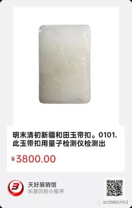 明末清初新疆和田玉带扣。此玉带扣用量子检测仪检测出年份为明末清初。玉带扣为长方形,正面雕刻有古树房舍和一古人,仿佛前行访友之意境,后面有沁入玉体的牛毛纹,开有凸出的长条孔,方便穿腰带,能穿过宽一点的皮带,配戴腰上护身辟邪,玉质细腻,温润光滑,无纹无裂无破损。尺寸:长66.6毫米,宽44.1毫米,厚 8.2毫米,洞长50.7毫米。重量:86.30克。来源:0101。V.