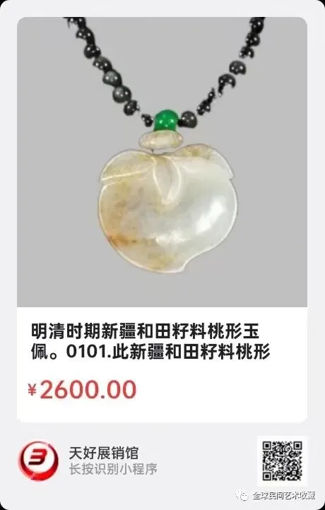 明清时期新疆和田籽料桃形玉佩。此新疆和田籽料桃形玉佩,上部有枝叶下部为桃形形状,桃子中间雕刻成凹形,铁锈红沁色深入玉质肌理,玉质滋润油润,迎光透明,自古以来桃子寓意为长寿。长58.2毫米,宽58.6毫米,厚3.8毫米,重18克。来源:0101。V.