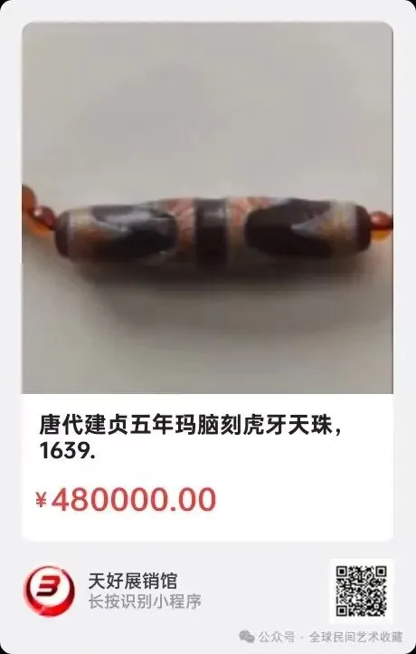 唐代建贞五年(公元890年)玛脑刻虎牙天珠,长5公分,宽1公分。来源1639.V.