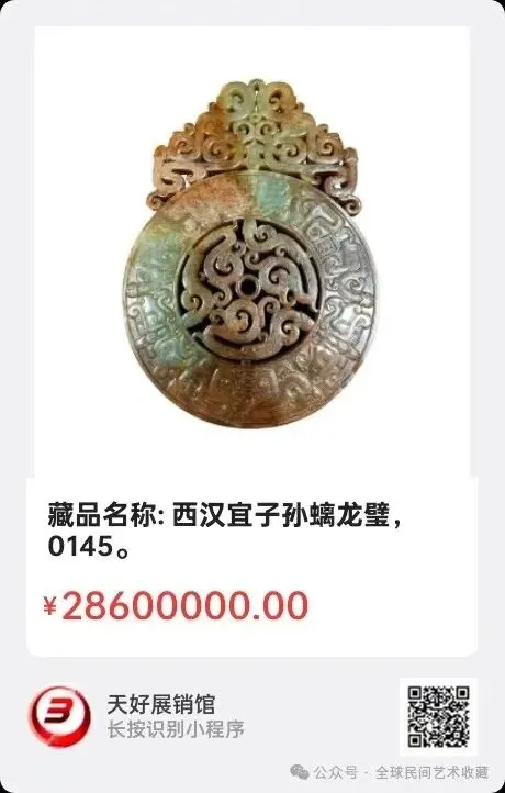 藏品名称: 西汉宜子孙螭龙璧,藏品尺寸: 高28cm 宽19.5cm,藏品描述:此西汉宜子孙螭龙璧,不仅是高雅精美的饰品,更是拥有者的身份、品味与文化素养的象征,它以其独特的魅力,穿越千年时光,依然熠熠生辉,令人心向往。此璧边缘圆润光滑,线条流畅自然,无一丝瑕疵可寻,展现出奢华的天然美感。更难得的是,此宜子孙螭龙璧还蕴含着深厚的中华民族的文化内涵与象征意义。玉,自古被视为吉祥之物,更是君子之德的象征,代表着拥有者的高洁情操与不凡的气度,成为最引人注目的亮点,让人不禁为之倾倒,赞叹不已。来源0145.V.