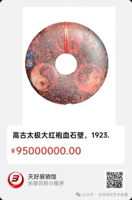 高古太极大红袍血石壁,内钻孔2.8厘米,重量151.8克。高古太极大红袍血石壁,一、年代判定依据,材质断代层面,鸡血石(辰砂)的应用史可追溯至新石器时代晚期,但工艺成熟期确在元代以后。需注意的是,天然辰砂晶体在氧化环境中形成的"氧化沁"现象,其形成周期通常需要千年以上地质作用。图中所示红褐色外皮呈现由内而外的渐变氧化特征,符合高古玉器沁色形成规律。工艺特征佐证,太极纹饰的阴刻技法呈现典型的宋元时期特征:线条采用"钉线刻"工艺,通过减地法形成凸起的阳纹边界,这种技法在唐代以后逐渐成熟。三个太极图案呈品字形布局,与西安何家村窖藏唐代鎏金银器上的多组纹饰排列方式存在承袭关系。来源1923.V.