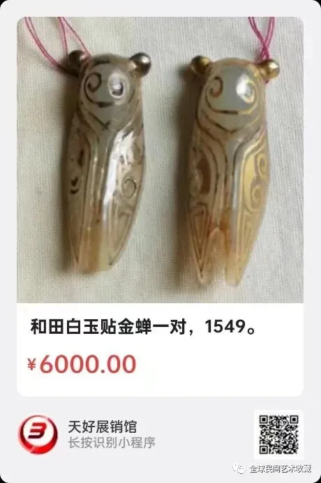 和田白玉贴金蝉一对,长3.2cm,来源1549。V.