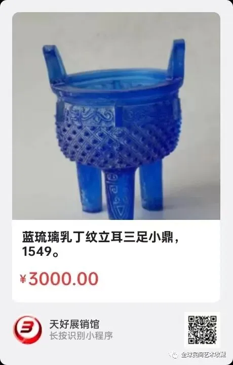 蓝琉璃乳丁纹立耳三足小鼎,口径9.5通高13cm,来源1549。V.