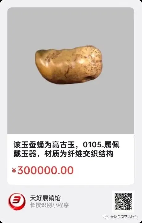 该玉蚕蛹为高古玉,长5、7厘米,厚3厘米属佩戴玉器,材质为纤维交织结构为岫岩河磨玉(有检测报告但不是河田玉),在腹部顶端有一开窗处可以看到显绿色,头部有对钻孔,造型简扑古雅,几处重要工艺特征与红山文化玉器非常符合。並有高古玉施专家的鉴定意见。来源:0105。V。