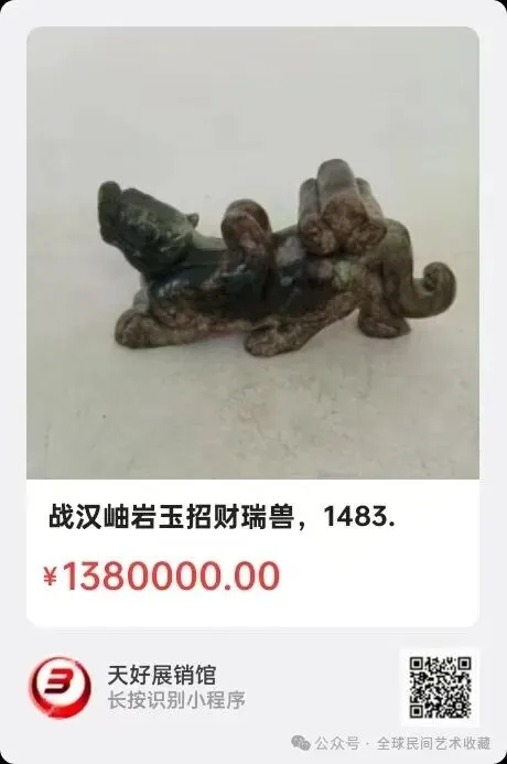 战汉岫岩玉招财瑞兽,高:7公分,长:13公分,厚:4公分,重量约:420克。赞:岫岩篆招财,灵动浑圆好运来,名玉揣心怀。金帛驮入室,子子孙孙都入仕,大展鹍鹏志。招财灵杰舞,天下祥瑞进门户,善缘上家谱。瓷痴随笔於乙已蛇年春月。来源1483.V.