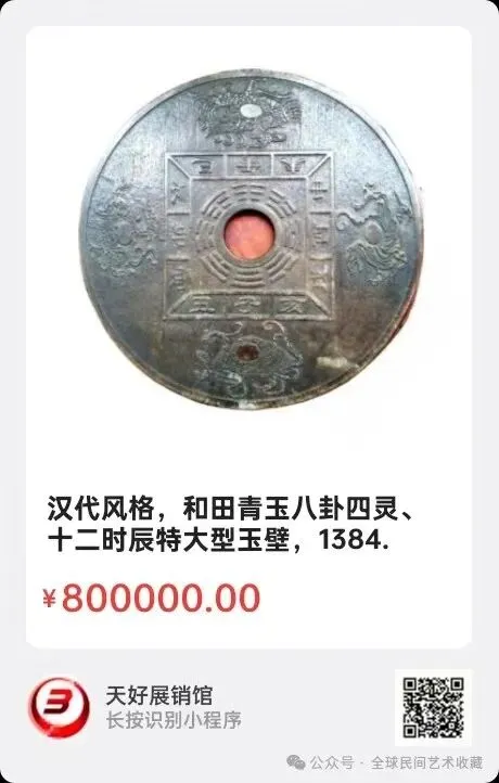 汉代风格,和田青玉八卦四灵、十二时辰特大型玉壁,(直径;300m /m,厚:10m /m,重量:2kg)。此汉代风格,和田青玉八卦四灵、十二时辰特大型玉壁,)整体造型硕大、古朴大气、厚重、精致,精雕细琢,刀工线条流畅、简洁明快,玉地底子平滑,转折有序,完全没有粗制滥造的感觉,也绝不同于近代的机器工艺。形体包浆老辣,用料厚重,磨损自然,一看上去不粗涩、不呆滞,确具古玉璧之形态。玉壁整体纹饰错落有致,正反面均三层布局:四大神兽、十二时辰、吉祥线条图案。四大神兽纹饰栩栩如生、传神有加,颇富艺术感染力,艺术水平极高,具有极高的欣赏价值。此法纹饰刻画细似头发,宛转流动,线条流畅,细如游丝,,所碾刻的纹饰细腻形象,动感强烈。综上所书,看似平坦的这一玉璧,却深深的蕴涵着中华民族精湛优秀的民族传统文化,因此收藏价值极高。 来源1384.V.