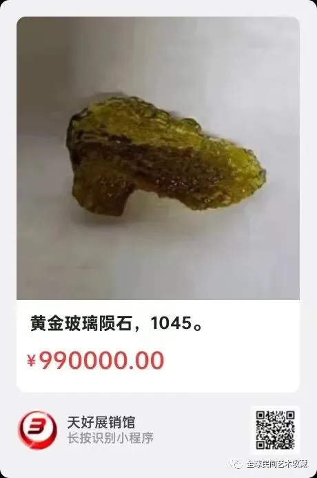 蓝绿色半透明玻璃陨石(陨石之王)重642克(近一斤三两)。有融壳、气印。还有融丝线,美不胜收。石铁陨石和玻璃陨石都是三十多年前在中国的国宝神农架的老君山丶太阳顶进行野外科考时寻获,系十万年前一次大型陨石雨广泛陨落鄂西北(神农架)、川东、陕南一带。经北京权威检测,含元素25种,远超其它玉石丶宝石的元素种类。有北京检测我老尹陨石的鉴定证书。来源:0169。尹本顺-新中国唯一的双栖科学家兼双料作家兼知名收藏家丶文物考古专家。