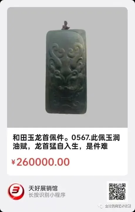 和田玉龙首佩件。长8公分、宽4公分,此佩玉润油赋,龙首猛自入生,是件难觅清代珍品。(此佩经专家曹晓宇鉴定为真品)。来源:0567。