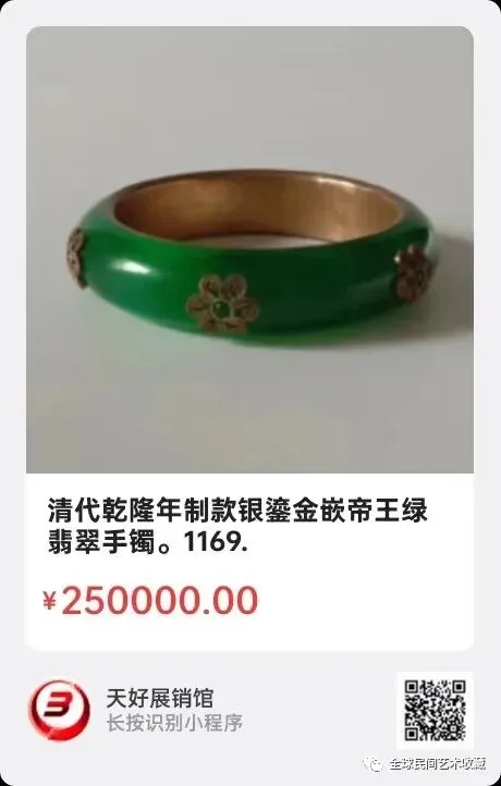 清代乾隆年制款银鎏金嵌帝王绿翡翠手镯。手镯内圈扁平,镶嵌银鎏金内圈,内圈上有一方形印章,上楷书"乾隆年制"四字,翡翠绿色纯正,翠性十足,抛光而细腻光滑自然,呈半透明,灯光下晶莹剔透,翡翠镯圈外间距贴三朵银质花朵,每朵花中嵌一翡翠宝珠,更显华贵。手镯直径7.8公分,内经6.0公分,寬1.8公分,厚0.8公分,摩式7度,重76.4克。来源:1169.