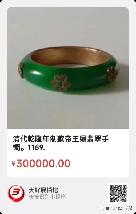清代乾隆年制款帝王绿翡翠手镯。手镯内圈扁,镶嵌银鎏金内圈,内圈上刻方形印章一枚,楷书"乾隆年制"四字。手镯翠绿,翠性十足,色泽饱满,半透明,灯光下莹亮通透晶莹滋润,份量十足,圈外贴三朵银花,每朵银花上嵌六个翡翠宝珠(有一朵花缺一宝珠),更显手镯的高贵美观,是现存清代翡翠手镯中少有的品种,十分珍贵。手镯直经7.8公分,宽2.3公分,厚0.8公分,孔径6.0公分,摩式7度,重102.3克。来源:1169.
