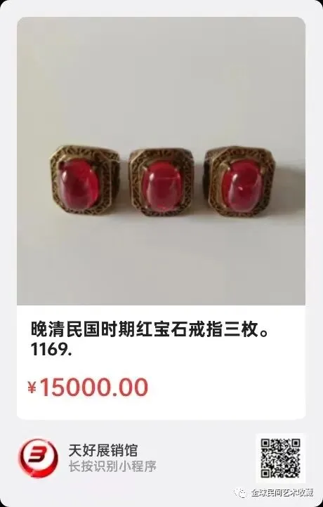 晚清民国时期红宝石戒指三枚。红宝石呈粉红色,长方形馍头状,在不同光线下变色,呈二色性,内见裂纹属十红九裂,三枚戒面硬度为摩式9度,宝石戒面镶嵌在铜托上,戒面四边铜雕花边,铜托缕空一边一个花蝴蝶,铜托为活扣,此造型现已罕见,属不可多得的红宝石戒指。A翡翠戒面长2公分,宽1.5公分。铜托戒面长2.5公分,宽2.1公分,重14.5克。B、C翡翠戒面、铜托长宽与A相同。B、C翡翠戒指分别重15.1克、14克。来源:1169.