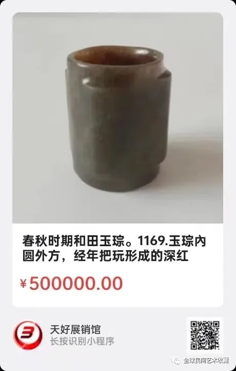 春秋时期和田玉琮。玉琮內圆外方,经年把玩形成的深红色包浆厚重温润,呈半透明,灯光下沁色饱满,更显古朴厚重感,是不可多得的高古玉珍品。玉琮长4.8公分,直径3.5公分,孔径2.9公分.重59.2克。来源:1169.