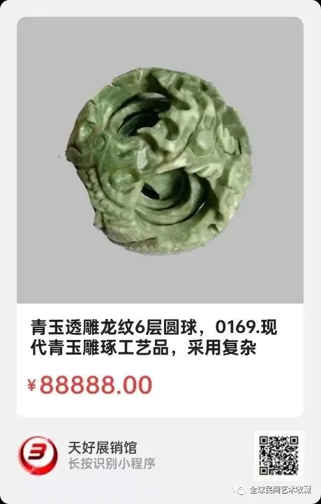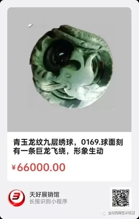 青玉透雕龙纹6层圆球,直径13㎝,重1105克(2点2市斤)。现代青玉雕琢工艺品,采用复杂艰难的透雕圆雕手法,工艺精湛,巧夺天工;表面为缠绕龙形图纹,配以花卉;内部六层皆活动自如,伸手指能转动每一层。为仿古时绣球形状,颇耐观赏,为现代玉雕精品,令人爱不释手。(早几年类似玉雕拍卖价几十万元人民币)。收藏者:尹本顺(尹笋君,74岁),上世纪中国知名收藏家兼文物考古专家,成果入选多家中国收藏家大辞典;三次入选权威的《世界名人录》,此大型中丶英文版《世界名人录》在北京中国国家图书馆(天安门斜对面)和全世界大型图书馆都有展示丶借阅。来源:0169。