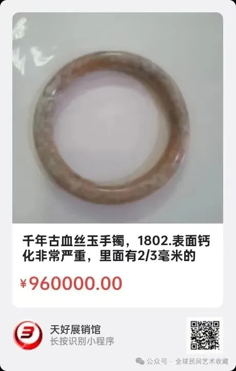千年古血丝玉手镯,表面钙化非常严重,里面有2/3毫米的鸡血红丝丝和大一点的血块块。口经59,是10毫米的圆条,重45.3克,是一个值得收藏的宝物。注~是正品。来源1802.